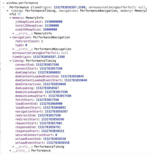 幾乎所有瀏覽器都支持window.performance接口 ,下麵來看看在控製台打印window.performance可以得到些什麽 :