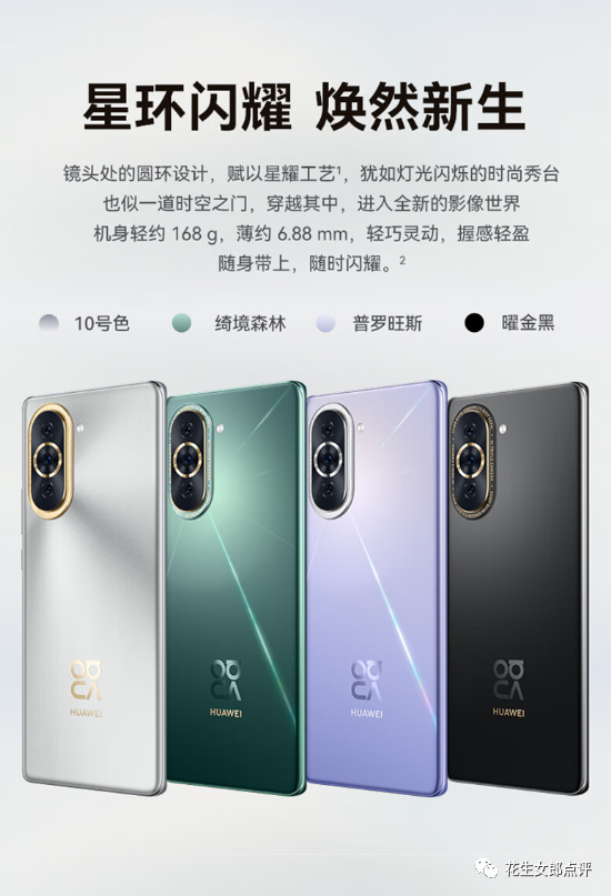 華為nova10第一款推薦“華為nova10”參考價2499元 ,這款可以說是又便宜目前華為最入門的手機 ,和其他的同價位手機比,它的優勢在於顏值和輕薄,168克的重量 ,6.88mm厚度真的是太薄了,我甚至都有些擔心會不會一屁股把這手機給壓彎了,不過輕薄的機身帶來的美感也是無以複加的,確實很漂亮。