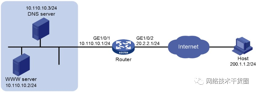 4.配置步驟按照組網圖配置各接口的IP地址,具體配置過程略開啟DNS協議的ALG功能 system-view[Router] nat alg dns配置ACL 2000,允許對內部網絡中10.110.10.2的報文進行地址轉換。