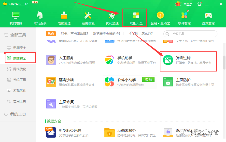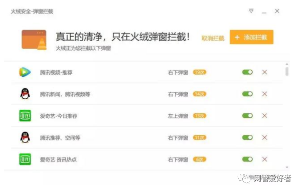三 ,第三方清理軟件攔截功能法電腦管家,安全衛士,火絨,金山軟件等都有自帶的窗口攔截工具它支持三種攔截方式,建議攔截,窗口記錄,截圖攔截可以一鍵檢測電腦中所有彈窗 ,並攔截這個也有個問題,第三方軟件本身自帶一些廣告 ,也許在設置裏麵永久關閉 ,或永不開啟,去掉對勾等操作。