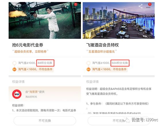 積分與會員權益掛鉤:在天貓和淘寶統一的會員體係中,有些會員權益除了對會員等級有要求外 ,還需通過一定的積分來兌換。如:“淘票票”的電影代金券和“飛豬”的酒店特權。會員權益圖示: